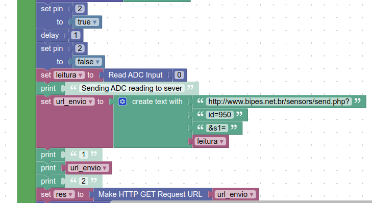 The figures below show an example of how to read the Digital to Analog Converter of ESP8266 or ESP32, while the LED blinks, and send the read value to the cloud using and IOT service and view the data in real time! The IOT tab of BIPES allows the collected data to be seen in a real time graph, historic graph, table view, or even export the data.