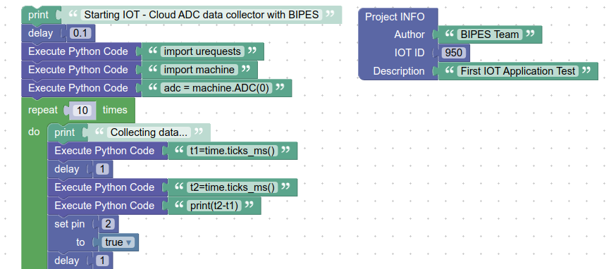 As figuras a seguir mostram um programa de exemplo feito com BIPES e sua saída no console quando o botão Executar foi clicado. Observe que mesmo quando os blocos para uma determinada funcionalidade ainda não estão disponíveis, um comando Python personalizado pode ser usado usando o bloco "Execute Python Code". Neste exemplo, lemos a BeagleBone Black ADC mesmo sem ter blocos para ele!